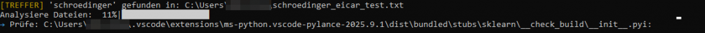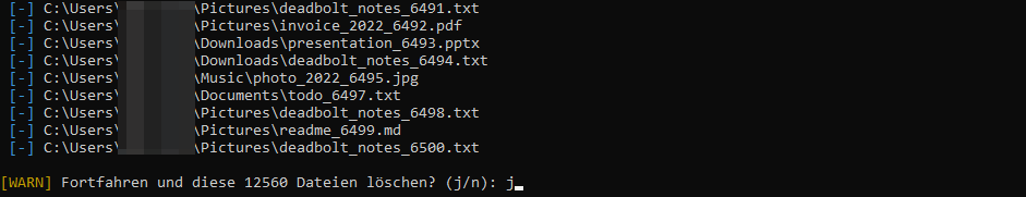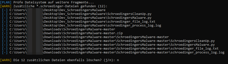 Sobald Sie die Löschung bestätigt haben, entfernt das Skript die ausgewählten Dateien und durchsucht im Anschluss das Dateisystem nach weiteren Dateien, deren Namen das im Header definierte Schlüsselwort enthalten. An dieser Stelle werden ausschließlich die Dateinamen überprüft – eine Analyse der Dateiinhalte findet noch nicht statt. Falls hierbei zusätzliche Dateien entdeckt werden, etwa die Skripte selbst, Logdateien oder Prozessdateien, können diese auf Wunsch ebenfalls entfernt werden:
