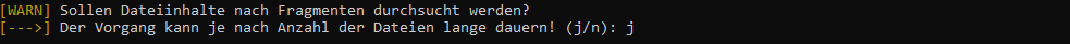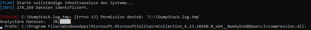 Fehler werden, wie oben dargestellt, im Terminal angezeigt. In vielen Fällen handelt es sich hierbei um Dateizugriffe, die trotz vorhandener Admin-Rechte nicht durchgeführt werden können – es werden ja ALLE Dateien gescannt.